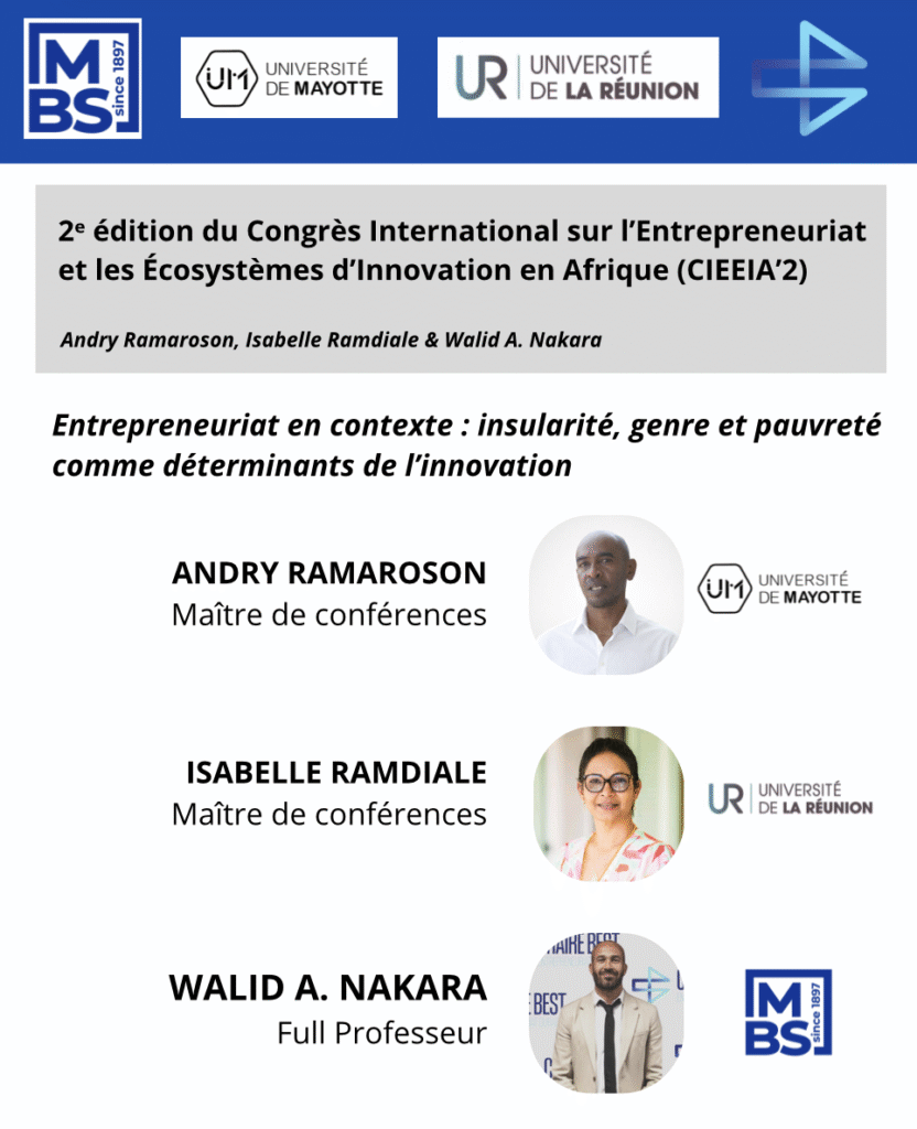 Notre papier « Entrepreneuriat en contexte : insularité, genre et pauvreté comme déterminants de l’innovation » a été accepté à la 2ᵉ édition du Congrès International sur l’Entrepreneuriat et les Écosystèmes d’Innovation en Afrique (CIEEIA’2).
